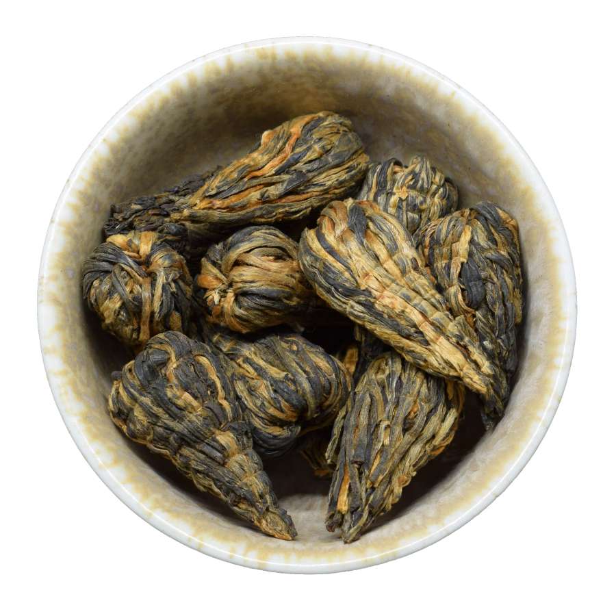 Tato pagoda Dian Hong Black byla před sušením svázána do kuželu. Po zaschnutí listů si tento tvar zachová, ale jakmile ji ponoříte do vody, listy se otevřou a vytvoří květ. Pagoda Dian Hong Black, kterou jsme vybrali, je vázaná ručně, ale na rozdíl od mnoha jiných kvetoucích čajů, jsou čajové listy použité k výrobě tohoto čaje velmi kvalitní a vytvoří šálek čaje s fantastickou chutí.